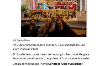 Laut, queer, solidarisch – Ein Fest für alle Am 14.09.2025 verwandeln wir die Strasse rund um den Sonntagsclub in einen queeren, bunten und widerständigen Begegnungsraum: QUEER MEETS KIEZ – das Straßenfest des Sonntags-Club in Kooperation mit dem Bezirksamt Pankow. Zwischen Poetry, Gesang, Impro-Theater, Diskussion und politischer Sichtbarkeit feiern wir unsere Vielfalt, unsere Geschichten – und … Queer meets Kiez – Das Straßenfest des Sonntags-Club weiterlesen